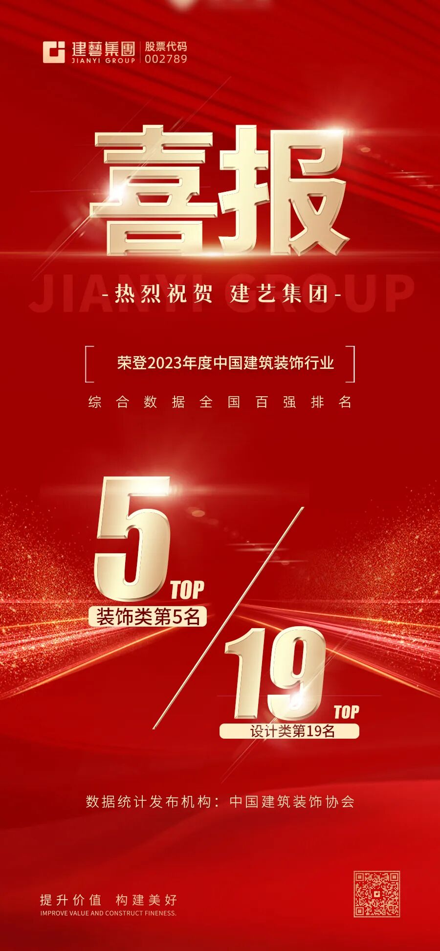 【重磅】建藝集團連續榮登中國建筑裝飾行業綜合百強榜裝飾類第5名、設計類第19名,榮獲三項“中國建筑工程裝飾獎”