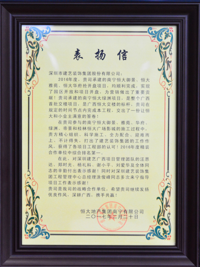 在我司參與的南寧恒大御景、南寧恒大雅苑、南寧恒大華府、南寧恒大綠洲、南寧恒大帝景和桂林恒大廣場(chǎng)影城等項(xiàng)目的施工過程中,我司工程管理人員精心組織、科學(xué)施工、全力配合、迎難而上,充分展現(xiàn)了建藝人的工作作風(fēng),得到了恒大南寧公司上下的一致認(rèn)可及表彰,榮獲 “2016年度精裝合作單位綜合排名第一”、 “優(yōu)秀合作單位”等榮譽(yù)獎(jiǎng)牌及表?yè)P(yáng)信,為建藝集團(tuán)贏得了榮譽(yù)!