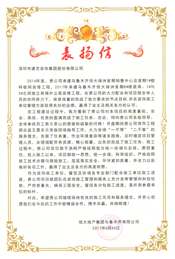 表揚信中提到,建藝集團工程管理中心工程總監王晟等領導以強烈的責任心多次親臨現場部署工作,帶領建藝人攻克了施工過程中工期緊、任務重、人員緊缺、作業環境復雜等一道道難關,保質保量完成既定目標,為工程的順利進行做出了卓越貢獻。此外,在工程建設過程中,烏魯木齊恒大綠洲項目部于洪剛與業主工程部一直緊密配合,高度重視工程質量管理控制和安全文明施工。最終,在集團領導和項目部人員的共同努力下,以及業主工程部的通力合作下,各項施工任務均圓滿完成。