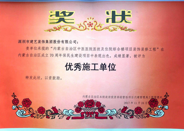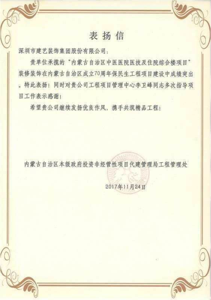 近日,由建藝集團承建的內蒙古自治區中醫醫院醫技及住院綜合樓項目裝飾裝修工程順利交付。該項目作為內蒙古自治區成立70周年保民生建設項目,我司在該項目建設過程中憑借精湛的施工技藝及優秀的項目管理,被內蒙古自治區本級政府投資非經營性項目代建管理局評為優秀施工單位。同時,工程管理中心李衛鋒在項目建設過程中,充分發揚了建藝人求真務實、盡職盡責的優良作風,獲得內蒙古自治區本級政府投資非經營性項目代建管理局的通報表揚。