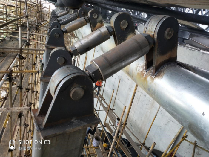 在施工過(guò)程中,有關(guān)該工程技術(shù)上的創(chuàng)新層面,樊華向我們介紹道:“山西太原濱河體育中心改擴(kuò)建工程施工過(guò)程中,由于建筑物的屋頂主體是大跨度的網(wǎng)架結(jié)構(gòu),存在外力荷載作用,網(wǎng)架變形的實(shí)際情況。項(xiàng)目經(jīng)理鐘正成在深化設(shè)計(jì)中,采用了雙向鉸接機(jī)構(gòu),既可傳遞幕墻水平荷載,又可適應(yīng)屋面的位移,在幕墻與屋面隔墻間采用風(fēng)琴橡膠板連接,一方面可保證幕墻的密封性能,另一方面可保證幕墻面板不被屋面較大的變形所破壞。鋼架底部的柱腳也在深化設(shè)計(jì)中既考慮了水平荷載和豎向荷載的安全功能性,又兼顧了室內(nèi)外的美觀性,采用了鉸接連接與焊接相結(jié)合的工藝,此項(xiàng)設(shè)計(jì)得到了建設(shè)單位及設(shè)計(jì)院的一致認(rèn)可并給予高度贊揚(yáng)。”