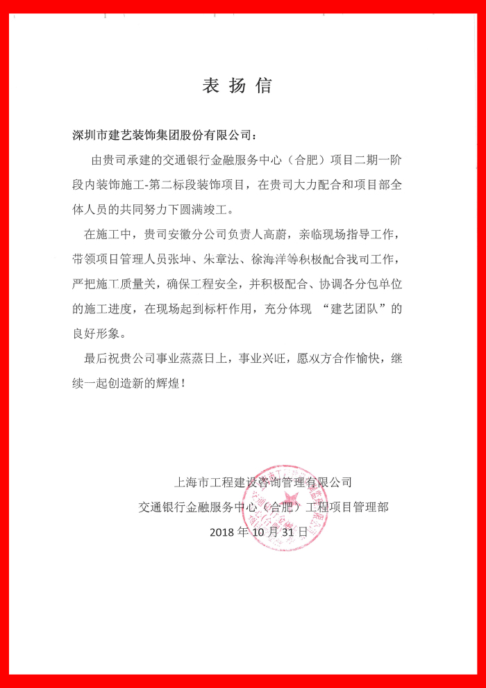 交通銀行金融服務中心(合肥)項目二期一階段內裝飾施工-第二標段裝飾項目圓滿竣工