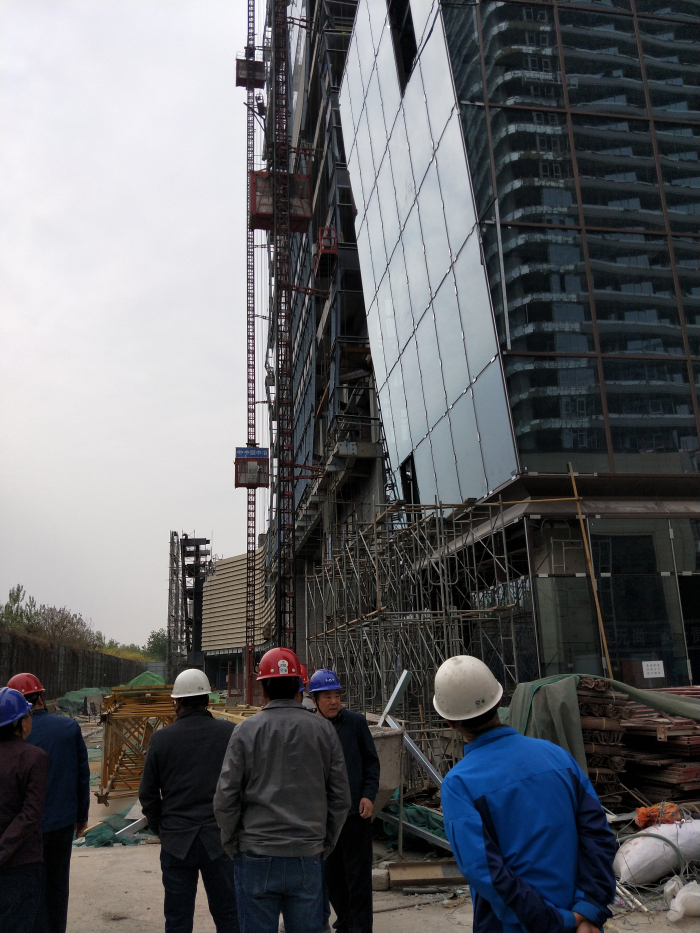 考察團(tuán)一行領(lǐng)導(dǎo)討論四號樓的施工效果