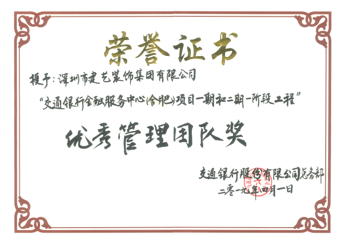 作為交通銀行輻射安徽合肥業務區域的重點金融中心項目,由建藝集團(安徽公司)參與打造的交通銀行金融服務中心(合肥)項目日前圓滿竣工。在隆重的項目竣工表彰大會上,建藝集團(安徽公司)憑借卓越的項目管理及一流的施工水平,出色地完成了該項目一期、二期一階段的裝飾施工任務,其精湛的施工技藝與高度負責的工作作風也獲得了交通銀行方面的充分肯定,一舉摘得“優秀項目團隊獎”殊榮。同時,安徽公司負責人高蔚也憑借高效的項目管理與專業的施工調度,榮獲“優秀項目經理/負責人”獎。