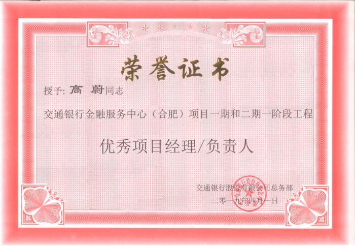 建藝集團安徽公司負責人高蔚——“優秀項目經理負責人”獎