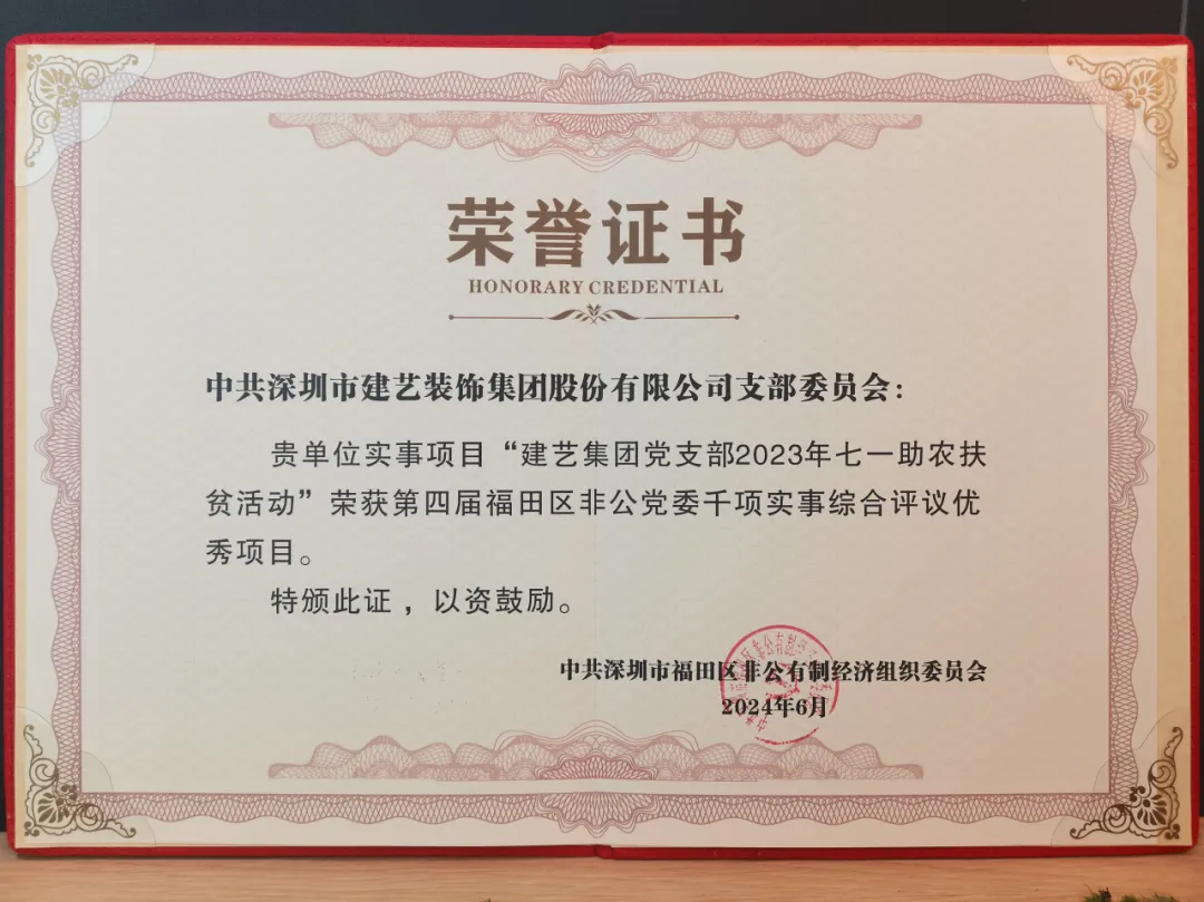 深圳市建藝裝飾集團股份有限公司黨支部(下稱建藝集團黨支部)受邀出席此次大會,憑借“2023年七一助農扶貧活動”實事項目在數十家非公黨組織中脫穎而出,被評為第四屆福田區非公黨委“千項實事”綜合評議優秀項目!