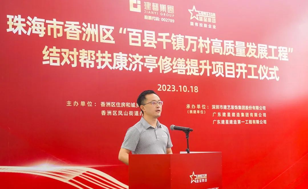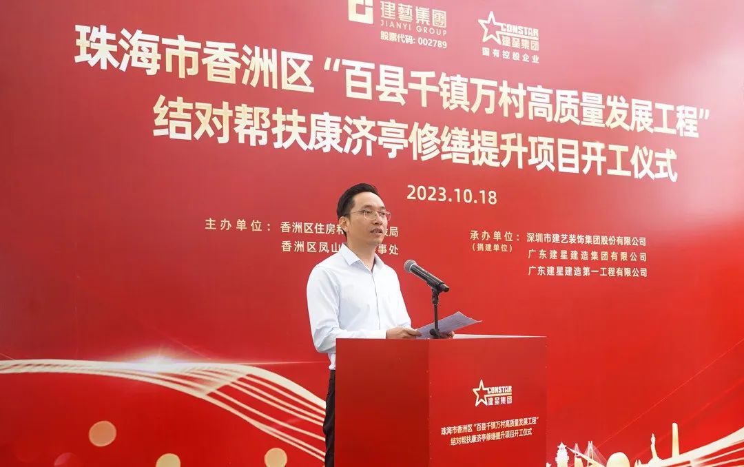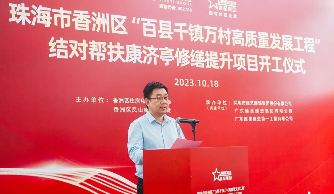 珠海市香洲區住房和城鄉建設局黨組書記黃志輝代表區委、區政府對建藝集團、建星集團結對幫扶致以衷心感謝。他表示,康濟亭修繕提升工程的動工,不僅是區積極貫徹省、市“百縣千鎮萬村高質量發展工程”工作重要開端,也是推進企業結對幫扶工作典范。項目的建設將有力推動全區引入社會力量參與歷史建筑保護工作,為賡續城市文脈、提升城市品位、進一步豐富城市內涵做出貢獻。