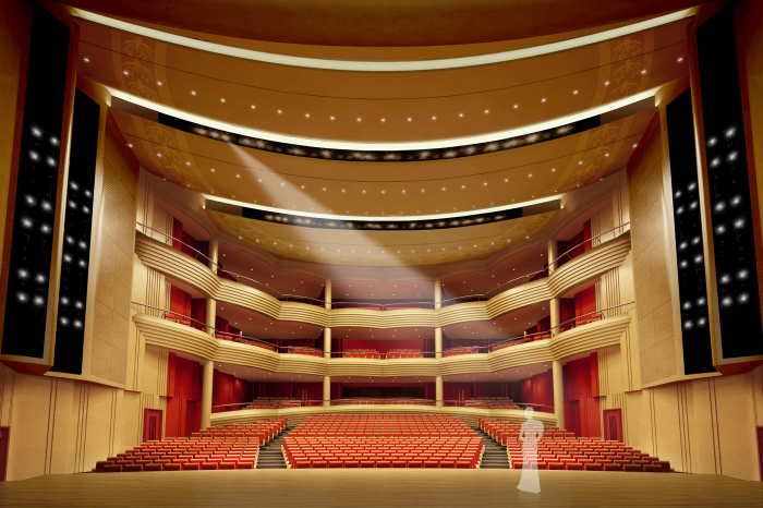 其觀眾廳天花設(shè)計為貫通的兩道面光的傳統(tǒng)模式,不但滿足了面光數(shù)量和角度的要求,呈階梯狀的弧面天花造型對聲音的傳播起到很好的擴(kuò)散作用,讓直達(dá)聲更多的到達(dá)觀眾席。天花避免單調(diào)的平頂造型,設(shè)計簡單的凹縫處理,內(nèi)嵌造型紋樣,取自秦文化的玄鳥圖騰。耳光室兩側(cè)位置設(shè)計回形紋樣造型,也是作為獨(dú)特藝術(shù)可識性的體現(xiàn)。把使用功能放在第一位,同時增加相關(guān)地域文化元素,讓整體達(dá)到經(jīng)濟(jì)實(shí)用目的,同時含蓄的體現(xiàn)了秦文化內(nèi)涵。