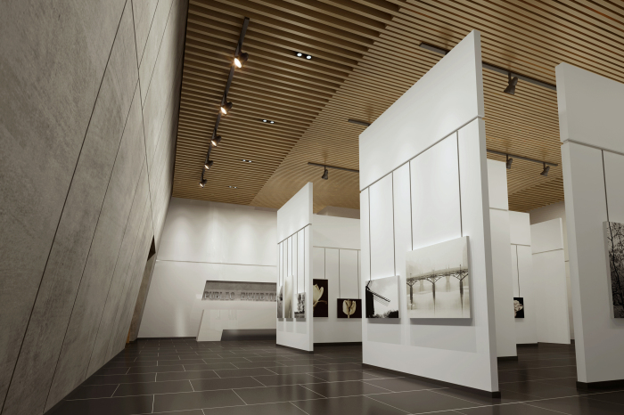 劇院入門大廳設(shè)計延續(xù)建筑設(shè)計手法,將建筑外觀元素進(jìn)行深化、細(xì)化及組合,形成豐富變化。將城墻磚的體塊感、灰紅對比等方式體現(xiàn)出歷史厚重感以及中華燦爛文化的親和力。墻面利用統(tǒng)一的米黃色洞石工字縫拼接,加強(qiáng)了空間的統(tǒng)一性與整體感。在材質(zhì)、造型、比例、色彩、照明等室內(nèi)設(shè)計多種元素上,注重相互關(guān)系與空間協(xié)調(diào)感。