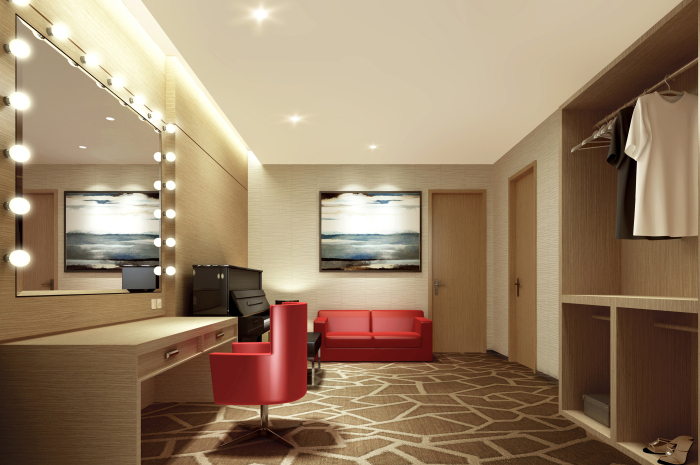 排練廳設(shè)計中,材料的統(tǒng)一強(qiáng)調(diào)空間的縱深感,墻面硬包的處理增加吸聲面積。天花與墻面融為一體,流動的線條與節(jié)奏韻律感相呼應(yīng)。
